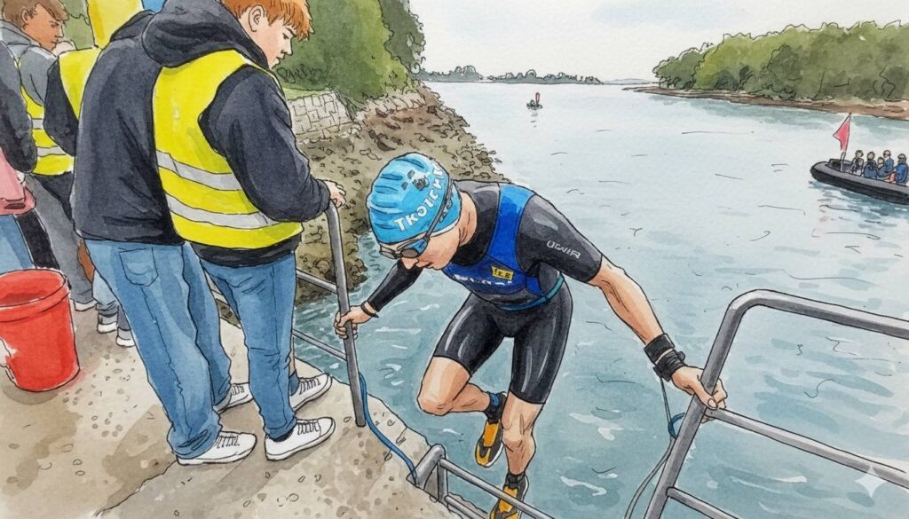 Nous prenons un départ que certains considéreraient comme rapide en course à pied. Pourtant, je suis sur mon allure marathon (autour de 4’10/km) en tractant Valérie. Nous entrons dans l’eau sur la première section de natation en même temps que les 2èmes et 4èmes binômes. Nous ne les reverrons plus : notre transition est catastrophique et sera à l’image de toutes celles que nous effectuerons durant cette course. Nous perdons de précieuses secondes à chaque entrée et sortie d’eau.