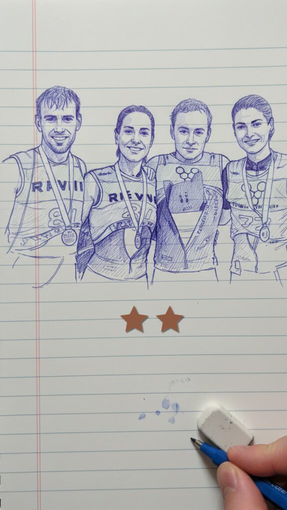Devant, Thomas et Johanne encore impérieux 🥇, seuls en tête du début à la fin, sans jamais trembler, en 4h28. 4h34 pour nous au terme d’une belle bataille qui nous laissera encore bien des souvenirs.