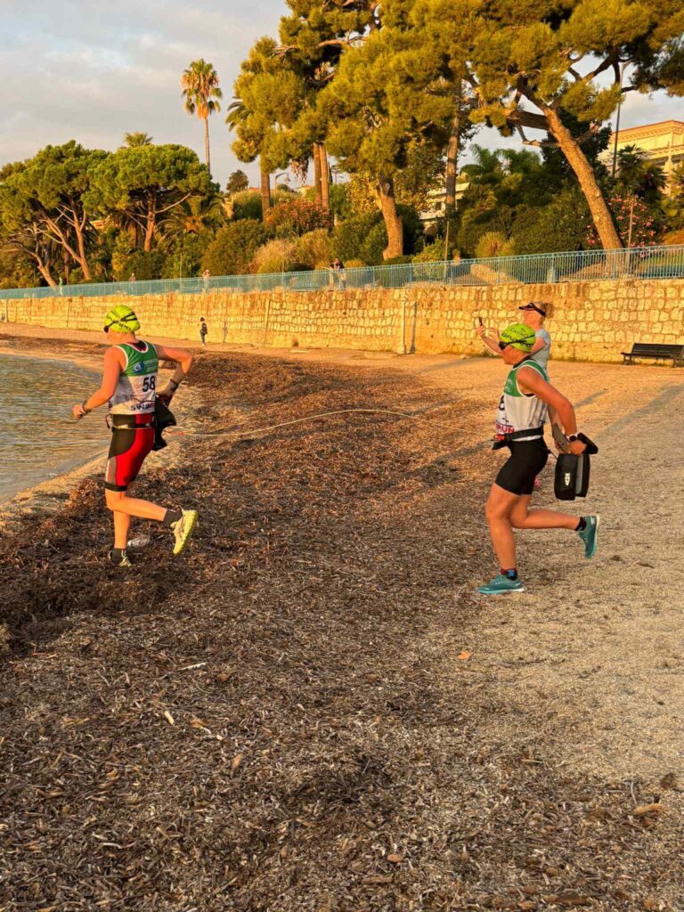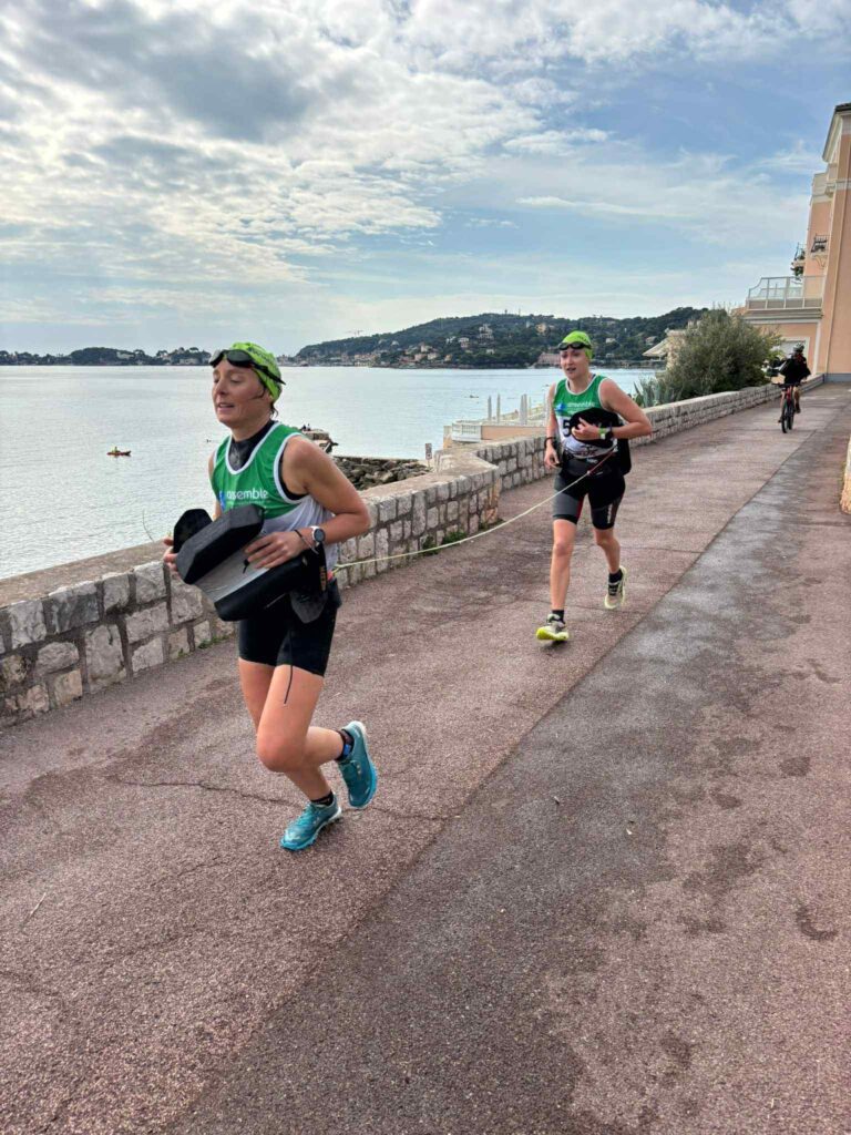 Malgré ce ralentissement dans l’ascension, nous avons appris que le second binôme féminin pointait à 10 minutes derrière nous. Fortes de cette marge confortable et sachant que la fin du parcours, revenant vers le Port de Beaulieu-sur-Mer, était principalement composée de natation et de course plus roulante, nous avons pu gérer notre effort. Le retour en mer nous a d’ailleurs réservé une dernière péripétie : slalomer entre les méduses ! Heureusement, nous avons réussi à les éviter et à préserver notre avance jusqu’au bout.