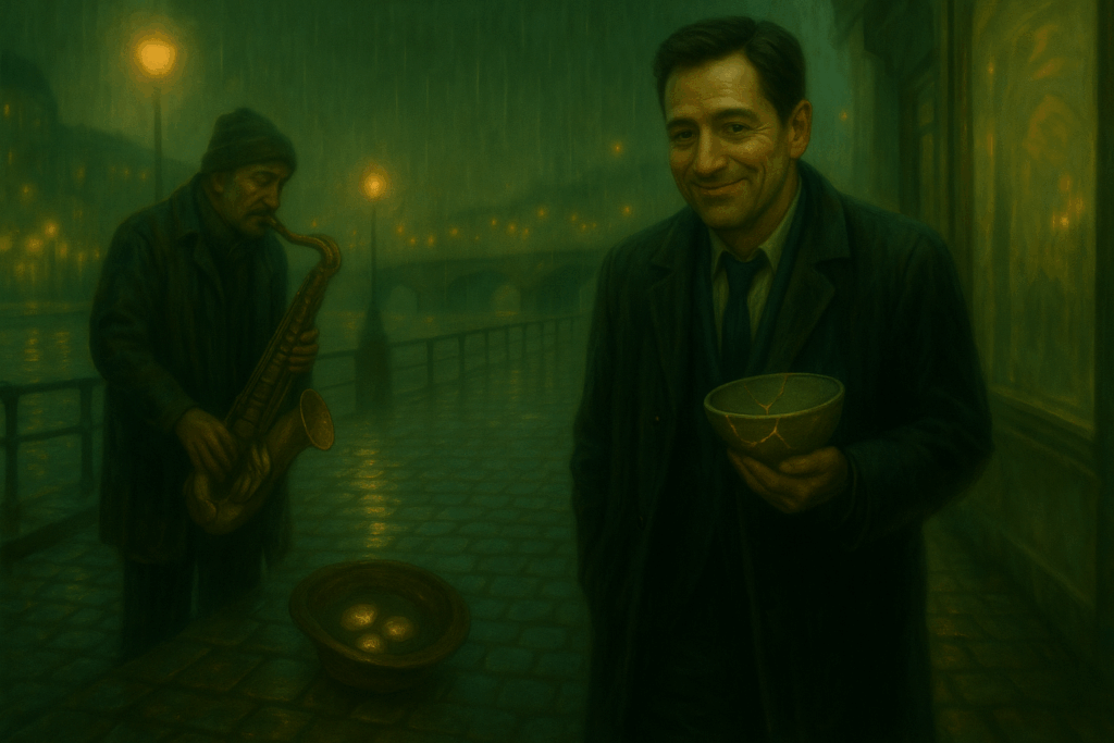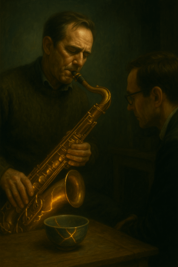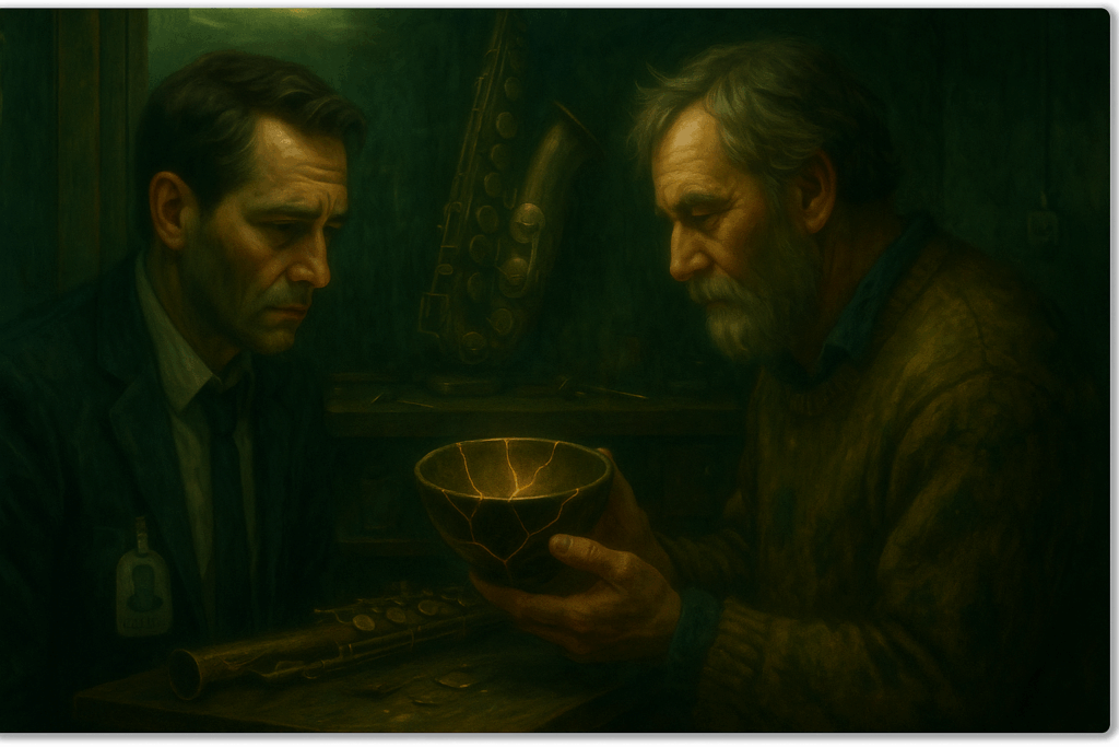 Lars puts away the saxophone with surgical delicacy. “You continue. But this time, you don’t count. You play.” He pushes the kintsugi bowl toward Louis. “And take this. Antonin wanted you to have it. He said you’d eventually understand you can drink from a broken bowl. That tea even tastes better when poured into gold-repaired cracks.”